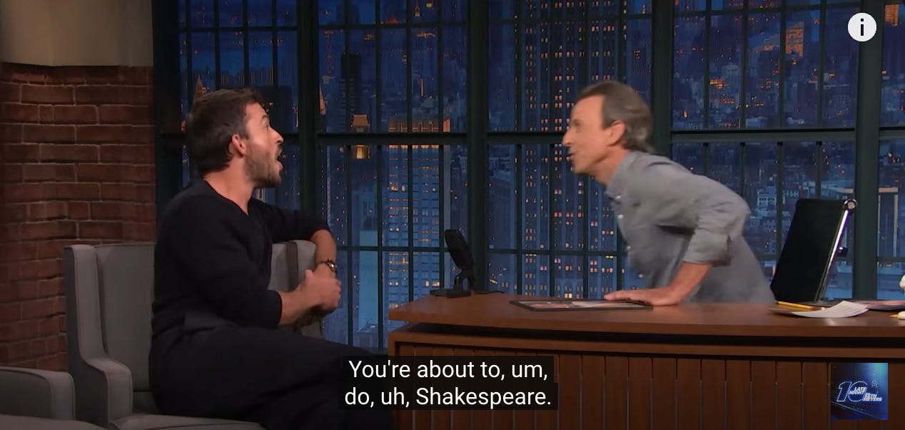 Seth Meyers pivots perfectly from prosthetic penises to Richard II.